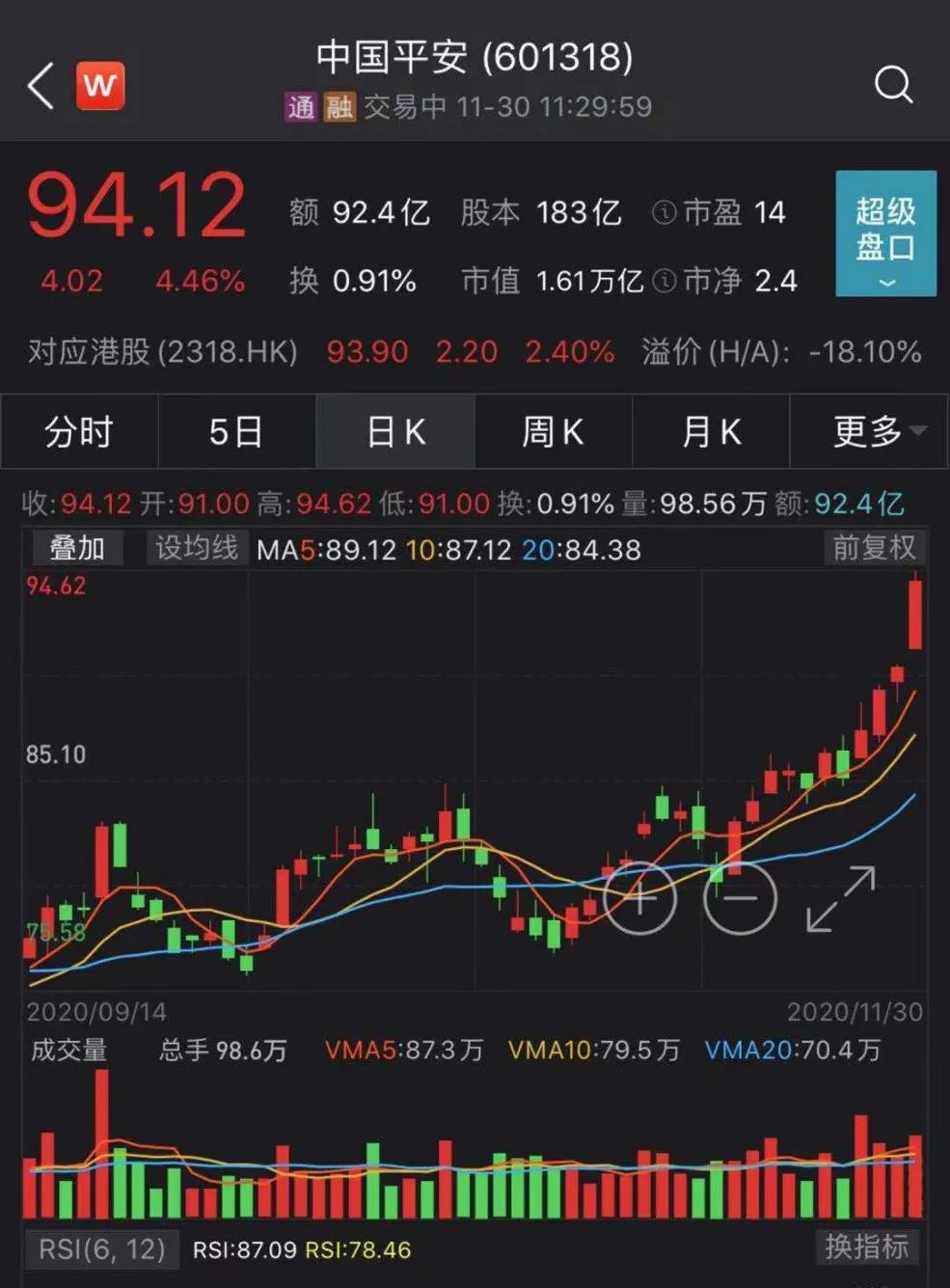 中国平安盘中最高价达94.58元/股,再创历史新高,截至午间收盘,中国平安半日成交额达92.4亿元,市值达1.61万亿元。