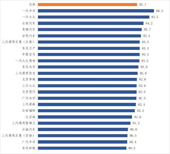 汽车质量满意度得分为84.0分,总体处于良好水平。 从汽车厂商层面来看,消费者认为汽车质量排名前五位的分别是: