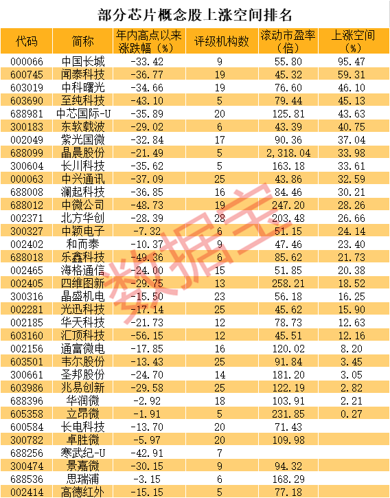 芯片概念能否王者归来?证券时报·统计显示,在5家以上机构评级的芯片概念股中,上涨空间最大的是中国长城,接近100%。不过,该股只有1家机构给予28.89元的目标价。此外,闻泰科技、中科曙光、至纯科技、中芯国际-U、东软载波等个股上涨空间均超过40%。