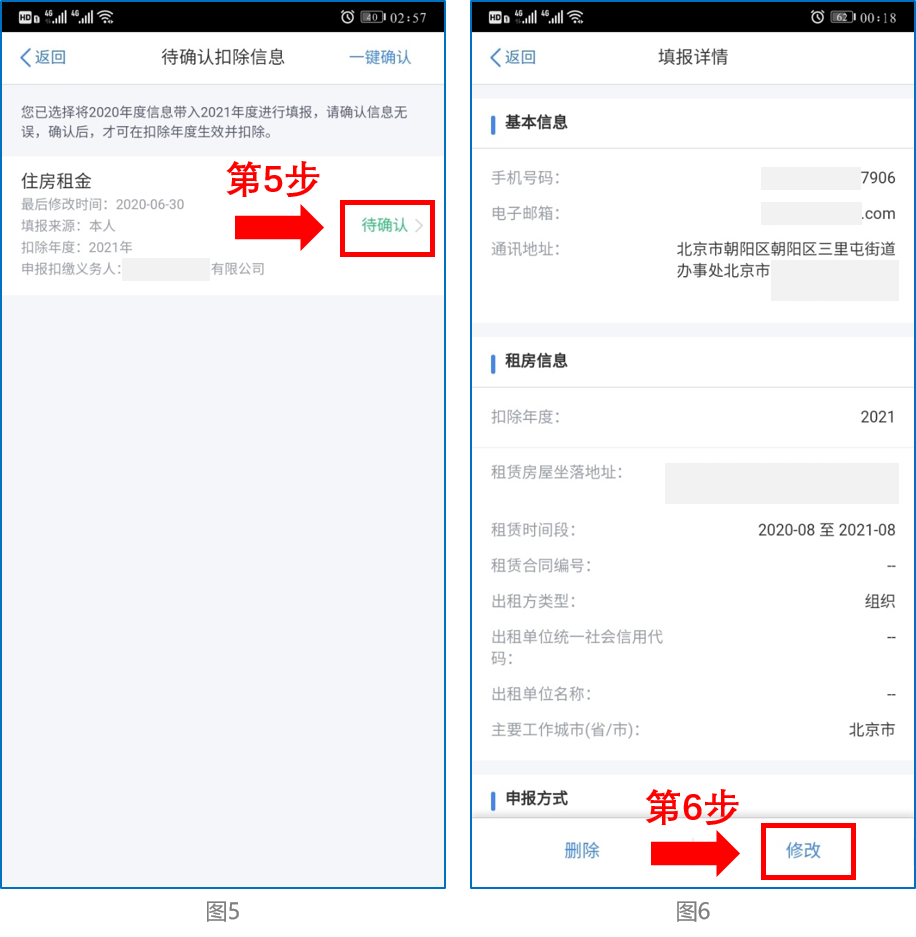 ③打开“待确认”状态的专项附加扣除,核对信息;如有修改,可以点击“修改”,信息确认后点击“一键确认”。如下图5、图6:
