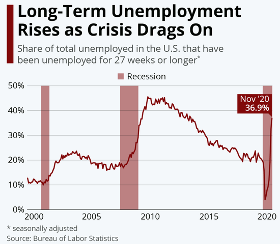 同时,长期失业率继续上升,接近金融危机后的最高水平。据美国劳工统计局的数据,将近400万美国人失业了27周或更长时间,这表明春季失去工作的人们再次找到工作有多么困难。如图所示,在美国,逾三分之一的失业者已经失业至少27周,而疫情前该比例为20%。