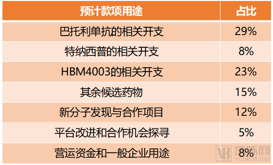 和铂医药的融资资金用途计划,基本与其管线分布一致。研发进度较快的巴托利单抗、特纳西普和HBM4003置于资金分配的优先位置上。值得注意的一点是特纳西普分配的资金并不多,只占融资总额的8%左右。从这一点上看来,在特纳西普完成干眼症的相关研究上市之后,和铂医药可能暂时不考虑该药的进一步适应症扩张。