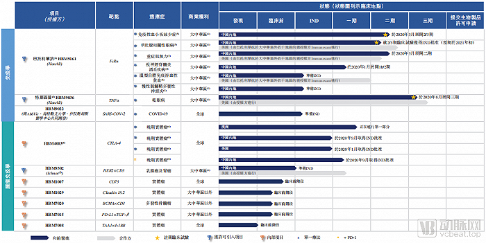 其余的产品,无论是引进的HBM9302,还是自研的多款产品,都还处于临床前研发阶段。靶点的选择方面,大多是近几年免疫治疗的大热门,比如CD73、Claudin 18.2、PD-L1/TGF-β等。