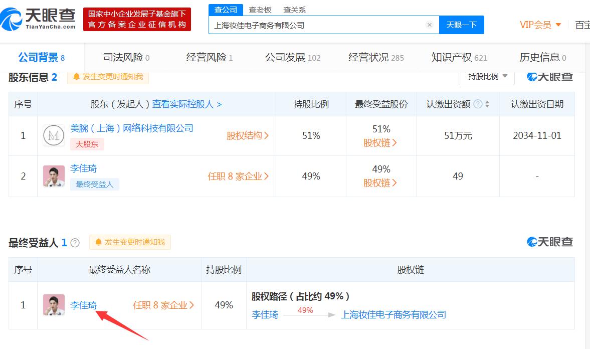 天眼查APP数据显示,上海妆佳电子商务有限公司股东为美腕(上海)网络科技有限公司和李佳琦,分别持股51%、49%,最终受益人为李佳琦。(中新经纬APP)