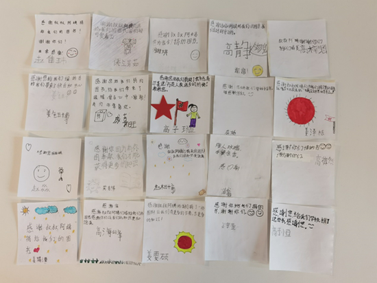 同学们们拿到崭新的图书和文具爱不释手,纷纷向叔叔阿姨表示感谢,并写下感谢的小卡片,回赠给爱心团。