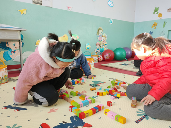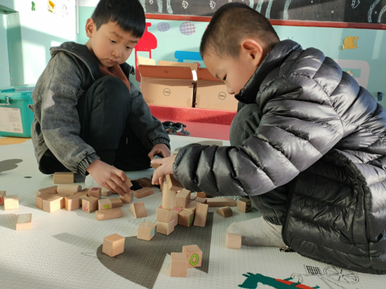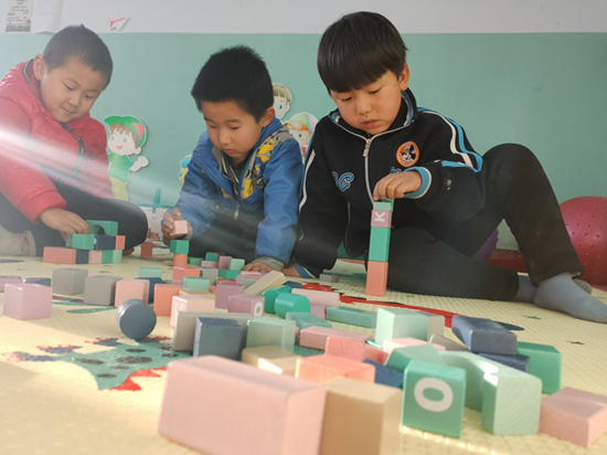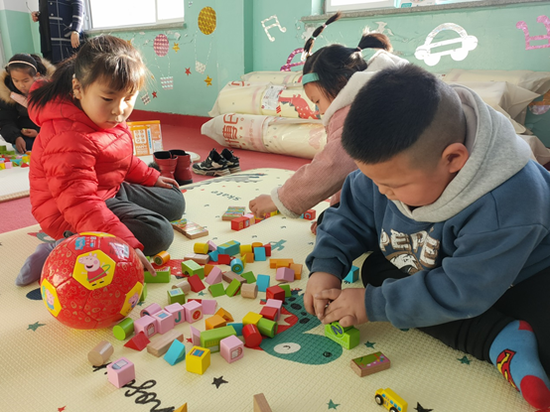 幼儿园的孩子坐在垫子上玩着新玩具,拼搭着梦想