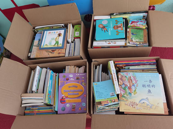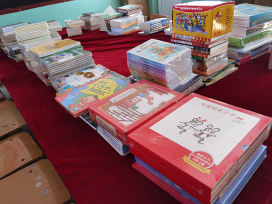 捐赠的新书摆满了桌子,原本空荡荡的书架不再孤单