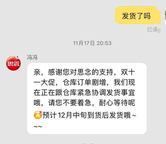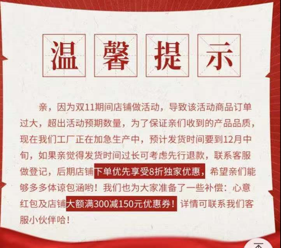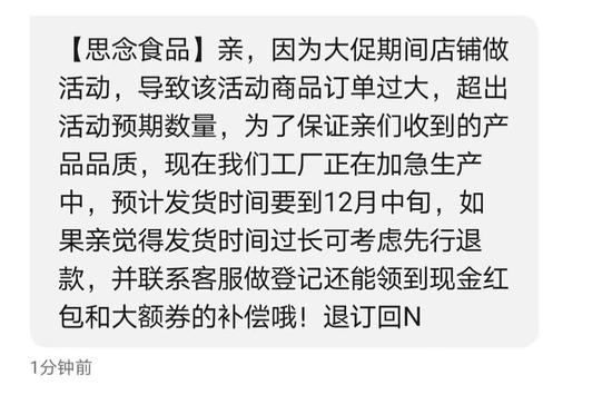 付款之后,王先生询问思念店铺客服发货时间。11日,客服称“双十一大促,仓库订单剧增,正在协调发货事宜,请耐心等待”。几天后,店铺发出一份“温馨提示”,称“预计发货时间要到12月中旬,如果觉得发货时间太长可以考虑先行退款”。