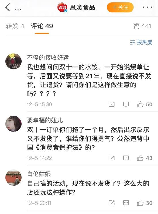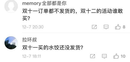 临近双十二,思念食品官博近日发布多条宣传及抽奖内容,而不少消费者在评论区质疑,“双十一的水饺还没发货,双十二的活动谁敢买?”