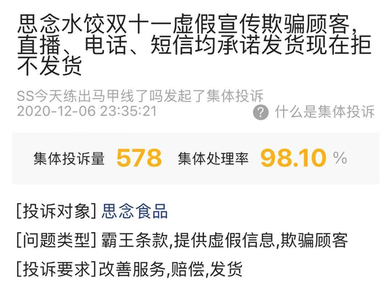 12月10日,《中国消费者报》注意到,在黑猫投诉平台,已经有567名消费者共同发起对思念水饺的集体投诉,认为其“虚假宣传欺骗消费者”、“霸王条款”。