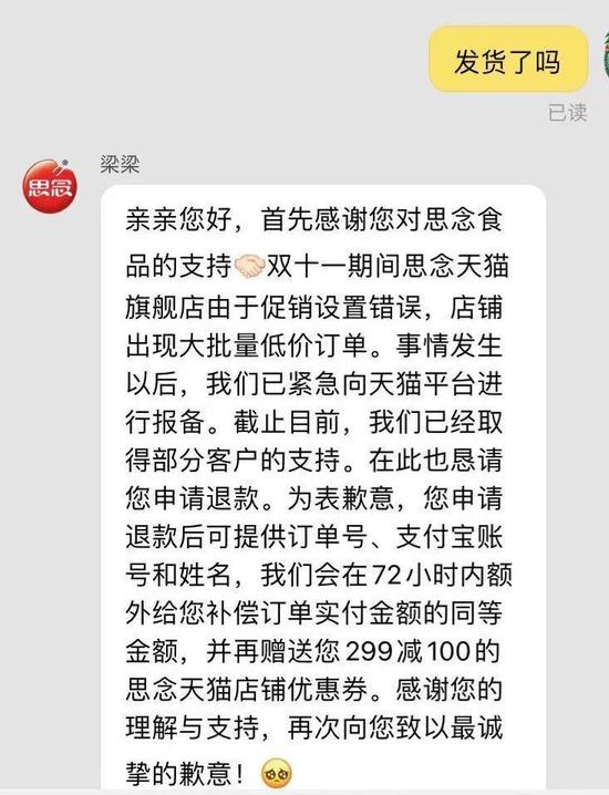 12月10日下午,思念食品媒体事务肖经理回复《中国消费者报》称,今年是思念食品第一次参与电商平台双十一活动,由于缺乏经验,将不同种类优惠活动错误设置为可叠加状态,所以出现部分超低价订单。肖经理表示,企业对这次失误为消费者带来不好的消费体验致歉,同时提出赔偿与实付款同等金额的现金及部分店铺优惠券的补偿方式,希望消费者可以体谅。