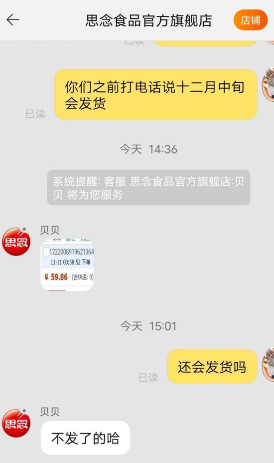 还有部分消费者晒出沟通记录,思念店铺曾发短信、打电话承诺12月中旬会发货。