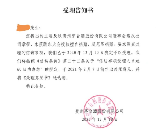 12月10日,此前实名举报“茅台董事会未经股东大会授权非法捐赠和超范围捐赠事项”的茅台股东在其个人微博发布了最新进展。该名股东于11月10日向国家信访局实名举报茅台董事会违规捐赠和超范围捐赠事项。并于刚刚接到了贵州茅台酒股份有限公司的“受理告知书”。该受理告知书显示,按照《信访条例》第三十三条关于“信访事项受理之日起60日内办结”的规定,将于2021年2月7日前作出处理意见。