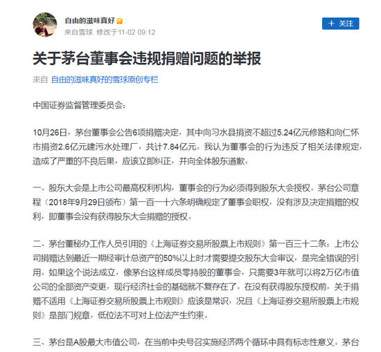 值得一提的是,对此事公开质疑的股东不止一人。此前在某平台上也有一个网友公开举报茅台董事会违规捐赠问题。