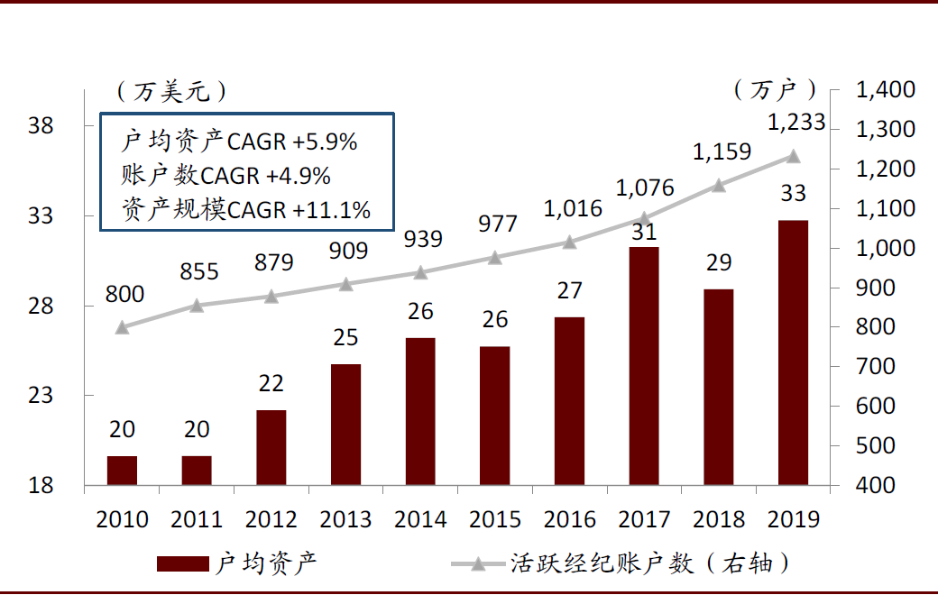通过“低价+优质”的业务模式,实现客户和公司的共同成长。嘉信的业务本质是以客户资产流入及增值带来的AUM增长为基础,以交易/融资/理财为代表的多元化收入类型为变现方式,通过持续的科技投入、平台化运营和外延并购提升规模效应,实现盈利(AUM x Take rate x Profit margin)的长期可持续增长。公司经营优势体现为:1)高运营杠杆:2009-18年期间,平均每年6%的客户资产净流入即推动公司EPS实现15%的稳健增长;2)成本集约:规模效应带来的成本摊薄使得公司具备持续提供“低价+优质”服务的基础,2009-19年公司平均资产费用率由24bps降至16bps;3)强客户粘性:一站式的综合金融服务、持续让利于客户的低价策略、技术革新带来的一流用户体验助力客户资产的长期留存。2019年嘉信户均资产规模达33万美元、位于美国上市零售券商首位。