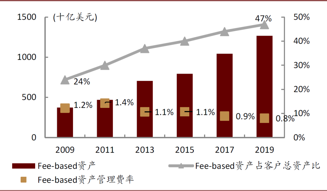 Fee-based收入不断增长,贡献财富管理分部半壁江山。从2019年财富管理业务的收入结构来看,资管收入(fee-based)占比58%、净利息收入占比24%、交易佣金收入占比17%;期末2.7万亿美金的客户资产中,fee-based资产占比达47% (vs.2009年24%)、fee-based资产管理费率~0.88%(vs. 客户总资产收益率水平~0.71%)。