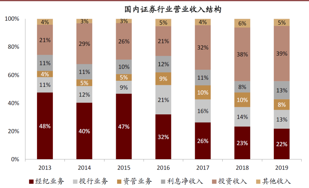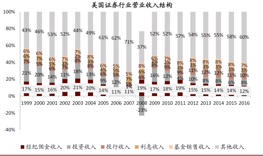 图表: 国内证券业经纪及投资业务收入占比逾60%,美国证券业收入结构相对更均衡