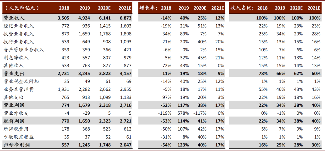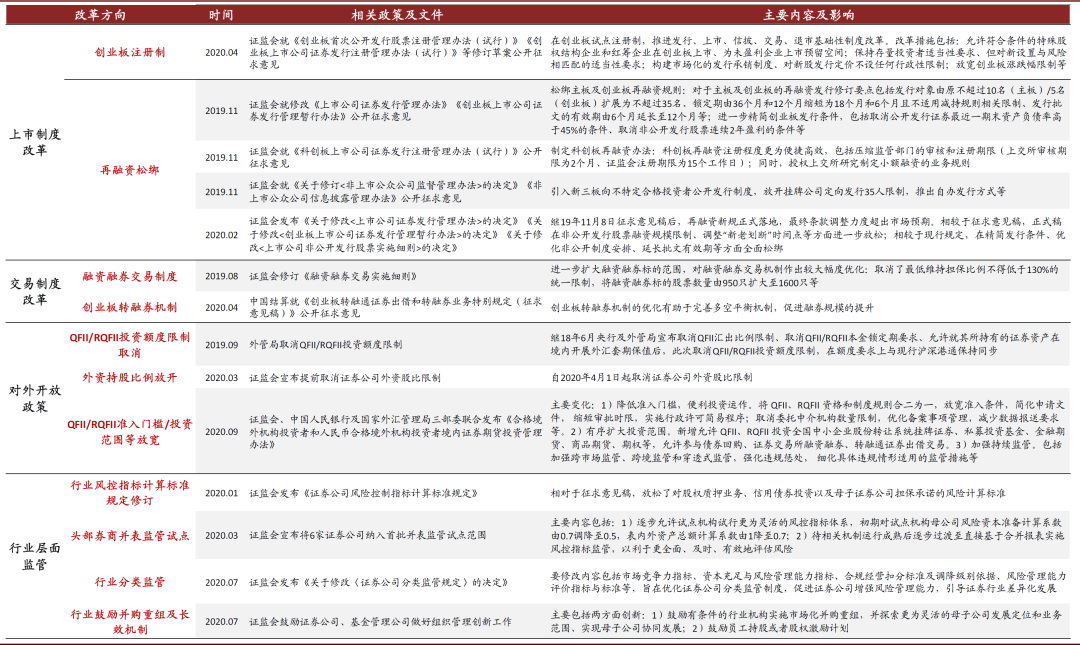 2019年以来,我们看到以科创板推进、创业板注册制试点、再融资松绑等为代表的上市制度及配套交易制度改革,以QFII/RQFII额度取消、准入门槛和投资范围放宽为代表的对外开放政策,以及行业层面风控指标标准修订、基金投顾业务试点、头部券商并表监管试点等政策支持均已落地。往前看,A股全面注册制改革、金融双向开放不断深化、场内外衍生品持续扩容、T+0/涨跌停等交易制度的进一步松绑等有望取得突破。在此背景下,证券公司作为资本市场重要的中介服务机构,将迎来市场广度及深度提升下的全面发展机遇,综合实力领先的头部公司受益或将更为明显。
