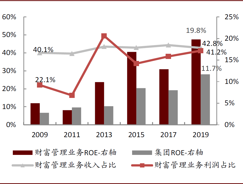 金融危机后开启财富管理转型之路。金融危机使得摩根士丹利自营投资及交易业务蒙受较大损失,公司开始寻求向抗周期性更强的财富管理业务发展。2009年,公司收购花旗美邦并更名为摩根士丹利财富管理,通过整合花旗的客户资源及销售网络迈入全球顶尖财富管理机构的行列;2011年后,相继出售Discover信用卡部门、市场数据业务部门MSCI以及部分风险较高的自营业务,持续向轻资产的财富管理业务转型;2019年收购加拿大股票计划管理服务商Solium,2020年收购折扣券商E-Trade,进一步拓展大众理财金融服务。过去十年,公司财富管理收入贡献由2008年的28%提升至2019的43%、利润贡献由22%提升至41%;过去三年(2017-2019年)公司财富管理业务平均ROE水平达17.6%、显著高于公司10.5%的整体水平;截至2019年底财富管理受托客户资产达1.3万亿美元、占客户总资产比例提升至47%。
