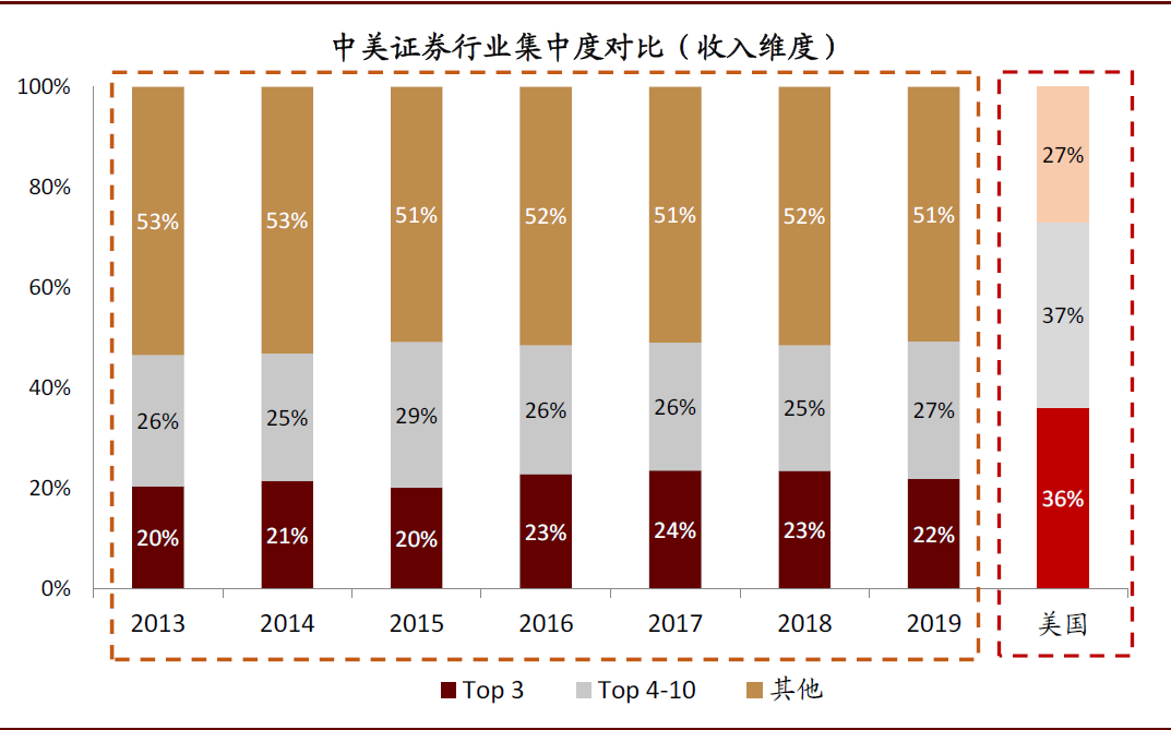 图表: 国内Top10券商合计营收市占远低于美国Top10