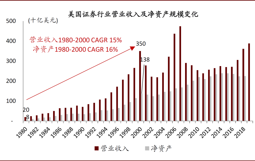 ► 机构资金入市、带动资本市场向好:长期属性的养老金入市与股票市场形成良性循环。一方面,1974年和1978年推出的IRA和401(K)养老金账户资金陆续入市,推动基金业以及股市迎来繁荣;另一方面,80年代中后期美国经济开始复苏带来股市繁荣,进一步吸引着以养老金为代表的机构资金。1980-2000年,美国道琼斯指数由825点增至11,723点、增幅超13倍,同期美国居民家庭资产规模年均复合增速8%。快速积累的居民财富和高涨的投资意愿,共同推动美国证券业的扩容。