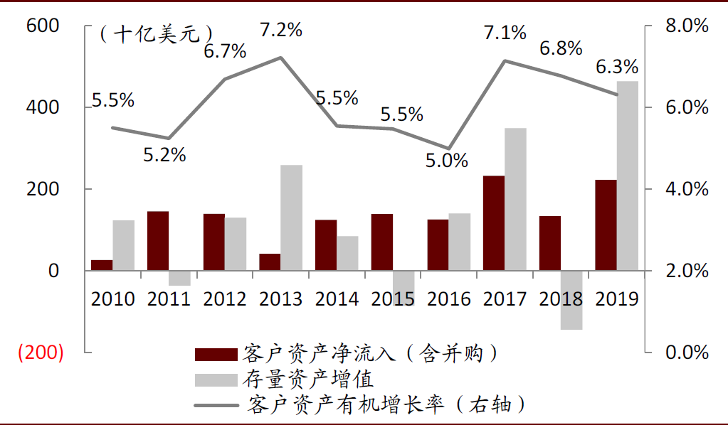 资料来源:公司公告, 中金公司研究部;注:有机增长率即剔除了非常规的一次性客户资产大规模流入/流出后的核心客户资产净流入/上年客户总资产