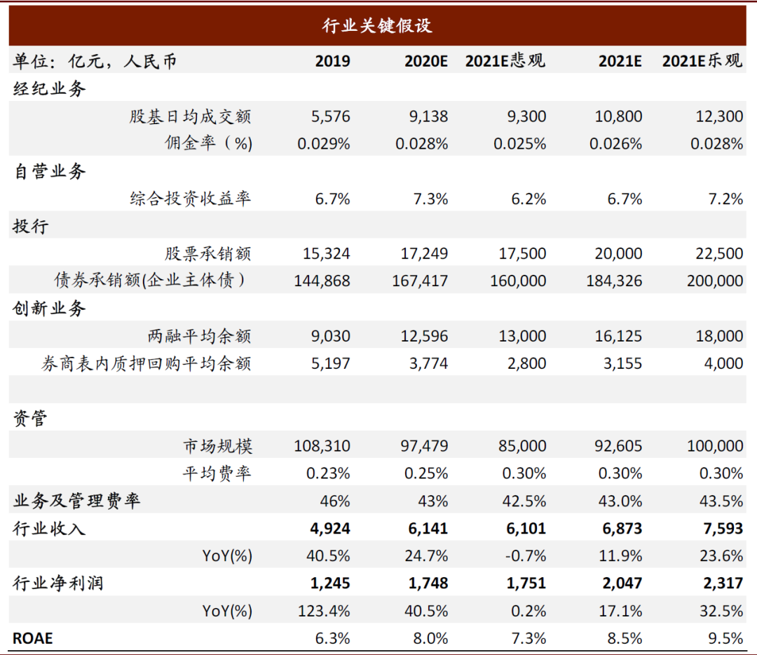 中性假设下,我们预测2021年证券行业营业收入同比增长12%至6,873亿元,归母净利润同比增长17%至2,047亿元(注:采用证券公司合并加总口径、大于协会母公司口径,详见图表51&52)。个股分化仍将持续,1)头部券商业绩高增长确定性更高,2020年大幅减值带来的低期数以及再融资之后产品业务需求强劲推动杠杆及ROE修复;2)2020年方向性投资业务大幅增长的公司或面临一定的高基数压力;3)预计大投行/资管/经纪结构性向好趋势仍将持续,相关业务占比高的券商业绩增速将高于行业。