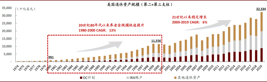 图表: 20世纪80年代美国养老金开始迅速发展、资产规模迅速提升