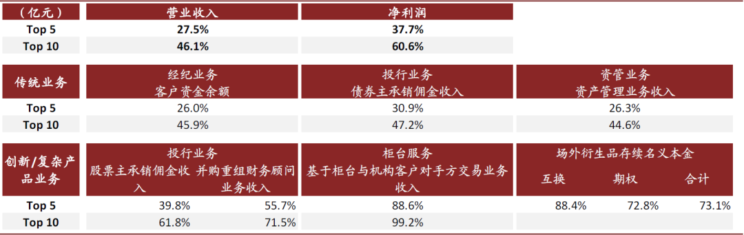 资料来源:证券业协会,中金公司研究部;注:各项业务收入集中度情况为2019年数据;场外衍生品存续名义本金为截至2020年9月末数据
