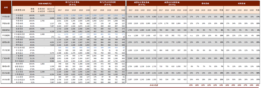 资料来源:万得资讯,公司公告,中国证券投资基金协会,中金公司研究部;注:1)资管主体营收除管理费及业绩报酬代表的手续费佣金收入,亦包括投资收益、利息收入等;2)资管部门/子公司及基金公司营收为毛收入口径、而券商整体营收为净收入口径,因此收入贡献比例的测算略微高估、但影响幅度较小(高估1ppt左右);3)中信/建投/申万未设置资管子公司,其相关营收及利润为测算值;4)基金公司AUM统计不含基金子公司私募资管计划