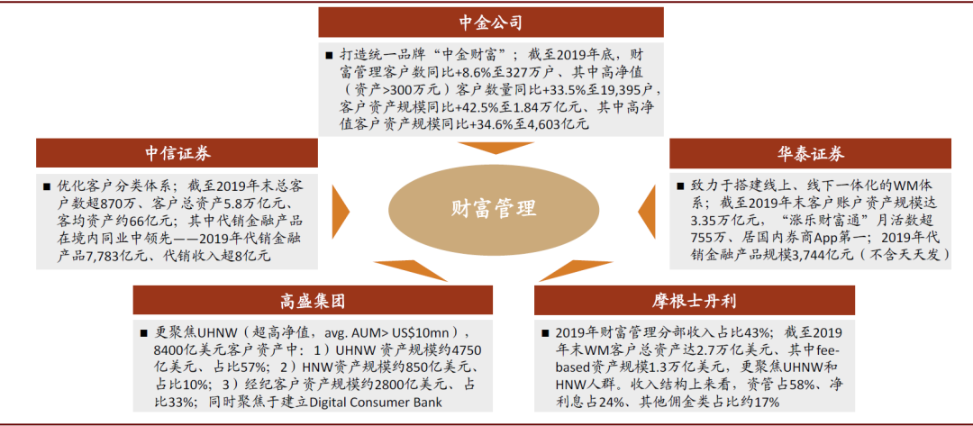 启示与对标:在当前居民财富加速向风险资产转移、传统经纪业务模式竞争加剧、买方投顾试点下投资者专业意识增强的趋势下,国内券商持续加大推进财富管理转型。然而相较于摩根士丹利等海外机构以“基于客户资产收取fee-based收入”为主的模式,国内券商当前仍以交易佣金和两融利息收入为主、资产收益率水平较低(我们测算2019年资产收益率水平:中信0.21%、华泰0.23% vs. 摩根斯坦利0.71%)。但我们也看到,头部券商通过一系列尝试积极探索财富管理转型之路,如收购聚焦于零售经纪的小券商并打造自身投顾团队、围绕客户需求推出专业化财富管理产品、与互联网巨头合作成立科技子公司赋能业务等。