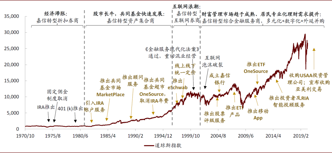 图表: 嘉信理财紧跟市场需求,把握住了从折扣券商、资产集合商、互联网券商到综合金融服务商的转型机遇
