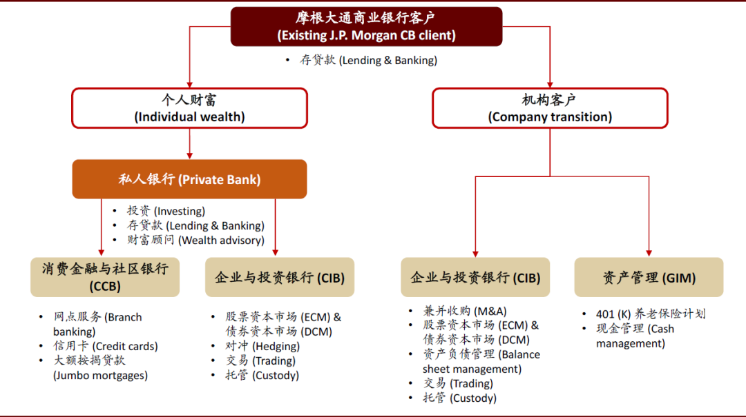 图表: 摩根大通以商行为中心、构筑起完善的客户引流体系及推介制度