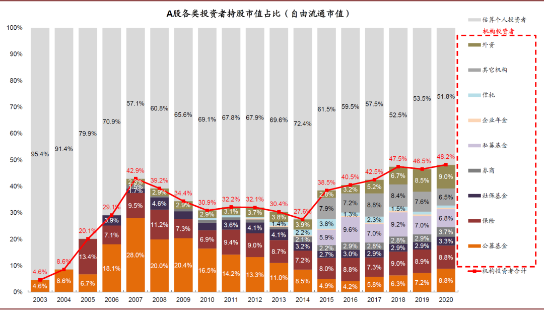 图表: A股机构投资者占自有流通市值的持股比例提升至当前近50%