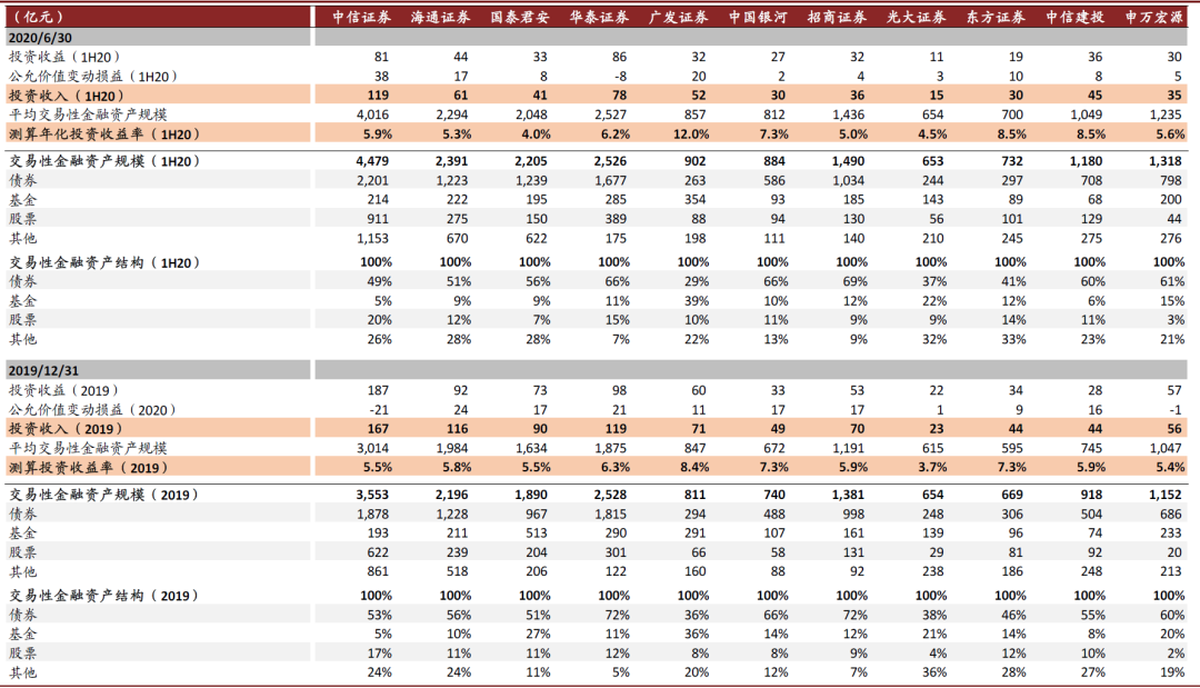 图表: 1H20及19年底大券商交易性金融资产结构及投资收益率测算