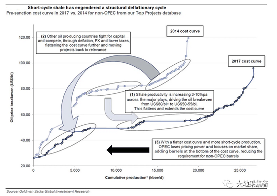自2014年开始,美国页岩油的成本逐年下降,2017年与2014年相比,下降了10—14美金/桶。由于水平井、水力压裂的普及,以及页岩油生产商聚焦于“甜点区”,页岩油的成本,10年内大幅度下降。一些之前评价不经济的石油储量,现在也能开采并能盈利。