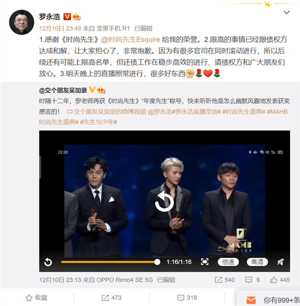 另外,罗永浩在时尚先生年度人物颁奖典礼上主动提及了自己被下发限制消费令的事情。