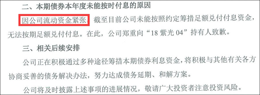 谈到债券本年度未能按期付息原因,紫光集团表示,因该公司流动资金紧张,截至目前未能按照约定筹措足额兑付付息资金,无法按期足额兑付付息,郑重向“18紫光04”持有人致歉。