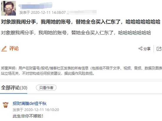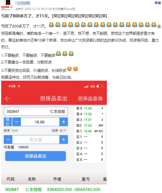 还有投资者留言称“几年的积蓄60多万全部押注仁东控股被套,如今只剩下10来万,今天早上跟老婆坦白一切,老婆当场就闹离婚,我该怎么办啊,急急急”、“爆仓了,不知道怎么面对一切,比买原油那次还痛,做人要脚踏实地妄想一朝发达”、“对象跟我闹分手,我用她的账号,替她全仓买入仁东了”。