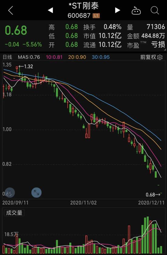 比起仁东控股的遭遇,*ST刚泰的处境也并不好过。今日收盘,*ST刚泰以0.68元封住一字跌停,目前已连续14个交易日收盘价低于1元面值,再来6个涨停也回不到1元及以上。