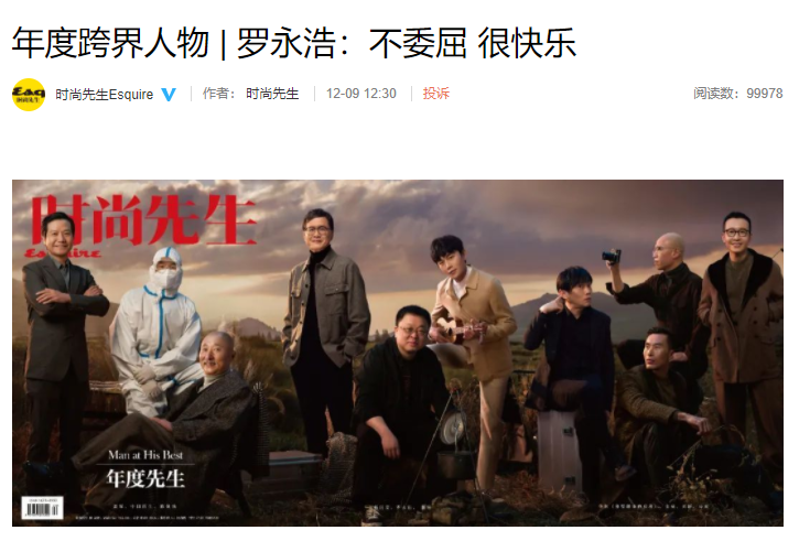 12月10日晚,罗永浩参加了《时尚先生》在上海举办的年度人物颁奖典礼。具体来说,他获得了“2020时尚先生年度跨界人物”的称号。