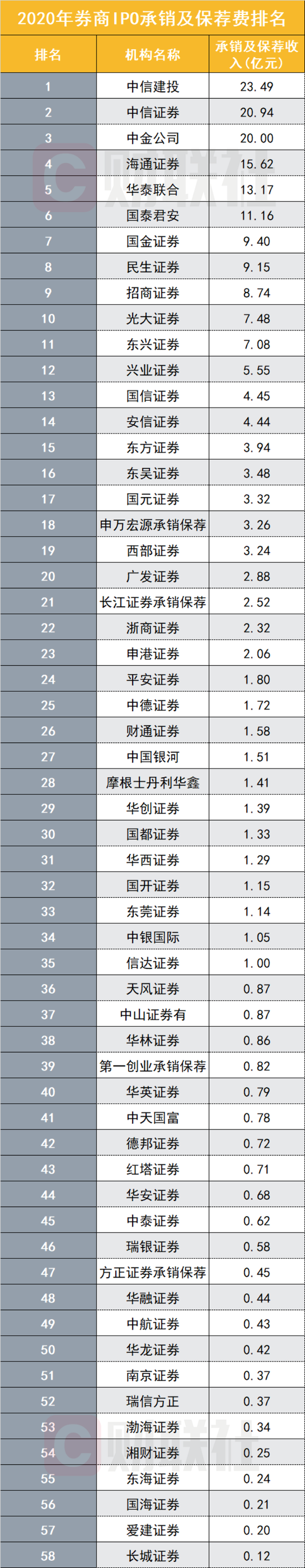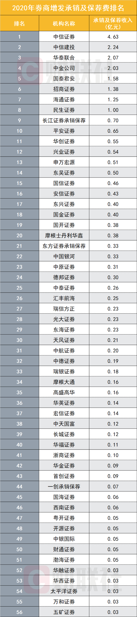 中金公司(2.03亿元)、国泰君安(1.58亿元)、招商证券(1.38亿元)、海通证券(1.25亿元)、民生证券(1.00亿元)、长江证券承销保荐(0.70亿元)、平安证券(0.65亿元)排在第四~第十位。