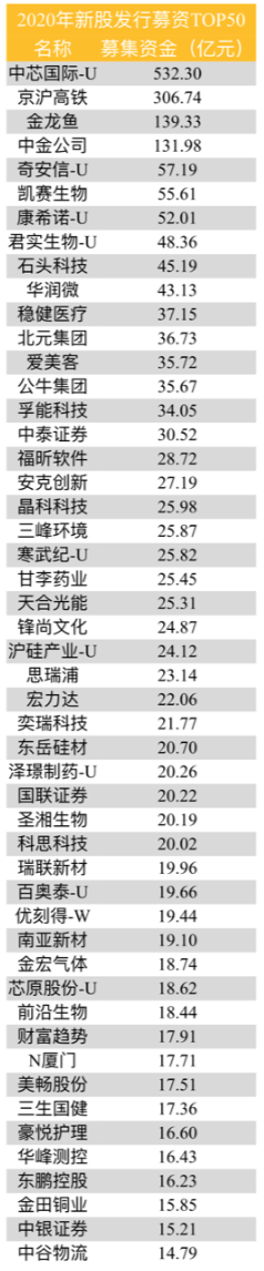 在东风集团之前,中芯国际为今年以来募资金额最多的公司,首发募集资金达532.30亿元,募资主要投向12英寸芯片SN1项目,补充流动资金,先进及成熟工艺研发项目储备资金等。中芯国际发行采用战略配售、网下发行与网上发行相结合的方式进行,并授予主承销商不超过初始发行规模15%的超额配售选择权。战略配售股票为8.43亿股,占初始发行数量的50.00%,占超额配售选择权全额行使后发行总股数的43.48%。除了其保荐券商旗下的海通创投、中金财富跟投外,参与中芯国际发行的战略投资者还有国家集成电路产业投资基金等另外27家机构。