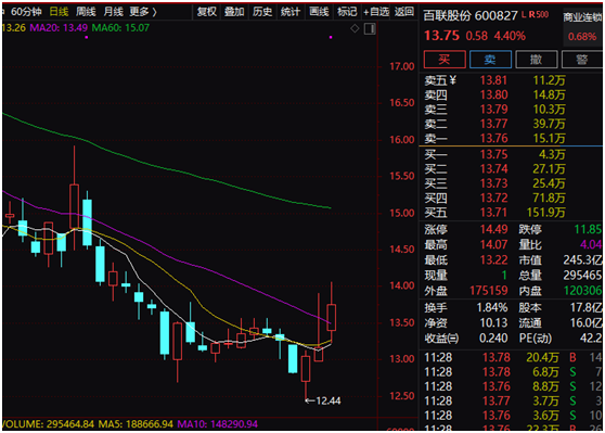 A股商超龙头百联股份一度暴涨近7%,此前该股自今年7月以来一路下跌,自高位腰斩。