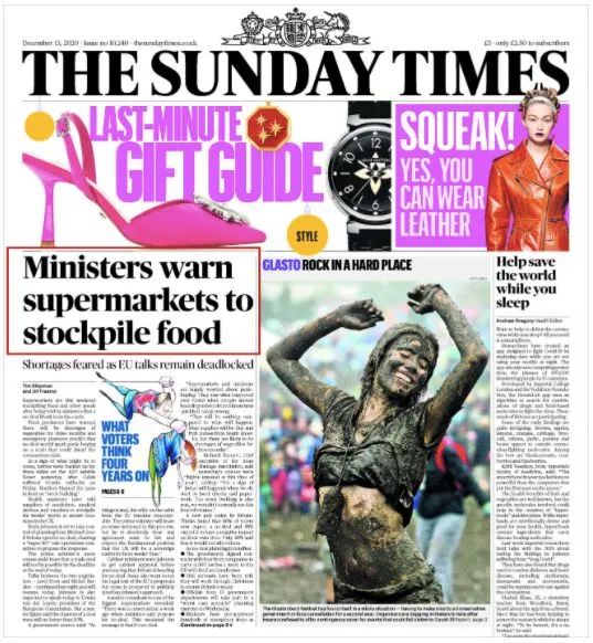 在此情况下,英国《星期日泰晤士报》12月13日的头条新闻,赫然出现了来自英国大臣们对该国民众的警告信息:为最后的无协议“硬脱欧”做准备,超市从本周末开始屯粮囤物!