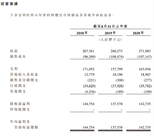 招股文件显示,通才教育2018年—2020年8月31日止年度营收分别为2.67亿元(人民币、单位下同)、2.66亿元、2.71亿元,毛利分别为1.71亿元、1.58亿元和1.64亿元。总体趋势基本持平,缓步增长。