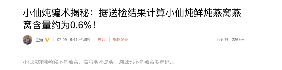 值得注意的是,今年7月,职业打假人王海通过个人新浪微博发布长文:《小仙炖骗术揭秘:据送检结果计算小仙炖鲜炖燕窝燕窝含量约为0.6%!》,其中指小仙炖存在“干燕窝含量5克及以上”、“0添加”、“固形物含量大于等于90%”等三大核心卖点虚假。