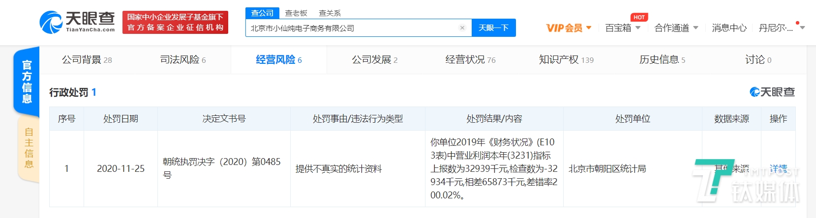 据启信宝显示,近日,网红燕窝品牌“小仙炖”关联公司北京市小仙炖电子商务有限公司被北京市朝阳区统计局行政处罚,处罚事由/违法行为类型为提供不真实的统计资料。