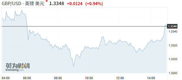 亚洲时段,英镑兑美元大涨,现报1.3348,涨幅0.94%,英国首相约翰逊此前与欧盟委员会主席冯德莱恩共同表示将继续推进英欧贸易谈判,提振了市场信心。