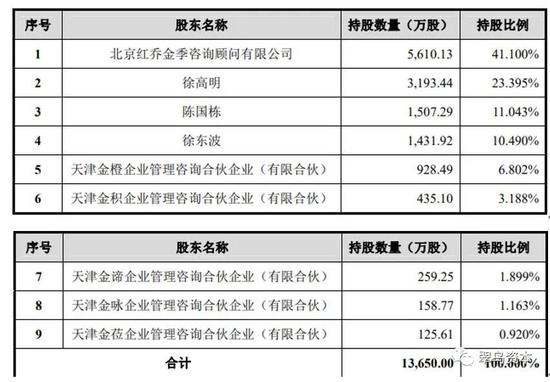 徐高明、徐东波父子合计持有公司控股股东红乔金季100%的股权。天津金橙、天津金积、天津金谛、天津金咏、天津金莅的执行事务合伙人均为红乔金季,上述五家合伙企业均为徐高明、徐东波控制的企业。